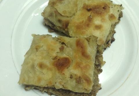 بعد ذلك نضيف اللحمة المعصجة على الرقاق و نكمل ثلاث طبقات اخرى على اللحمة