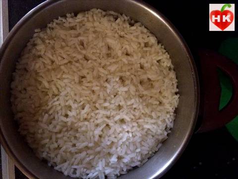 ثانيا لتحضير الارز الأبيض: في قدر على النار نضع زيت الزيتون والارز ونقلبهم معا حتى يصبح لون حبات الأرز أبيض ثم نضيف الماء الساخن ونفتت مكعبات المرق ونضيف الملح والفلفل الاسود ونقلب وعندما يغلي الماء نخفف النار ونغطيه ونتركه حتى ينضج الارز ثم نرفعه عن النار