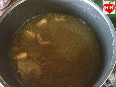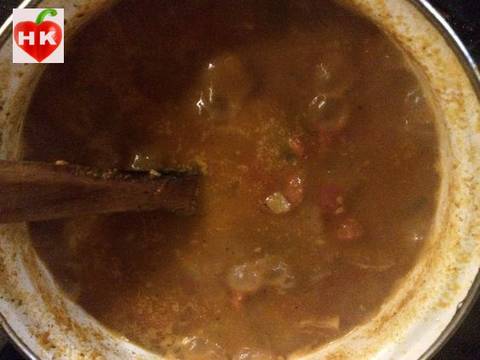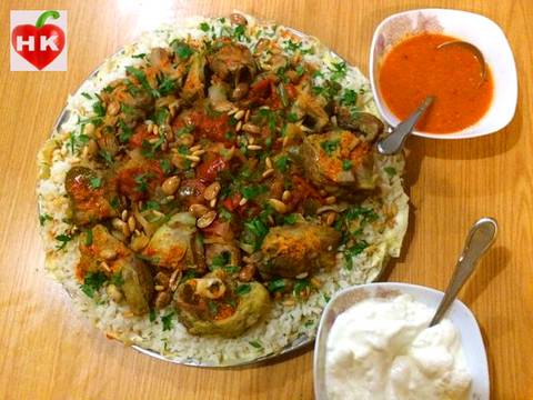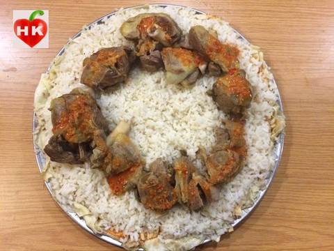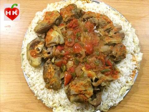 اولا لتحضير اللحم : في قدر واسع على النار نذبل البصل في زيت الزيتون ثم نضيف اللحم ونشوحه قليلا ثم نضيف الماء الساخن والهيل وورق الغارونخفف النار ونتركه يغلي مع غزالة الزبد المتكون على وجه القدر وعند نضج اللحم نضيف الكركم والملح والفلفل الاسود والكزبرةونتركه يغلى لمدة 10 دقائق أخرى ثم نرفعه عن النار