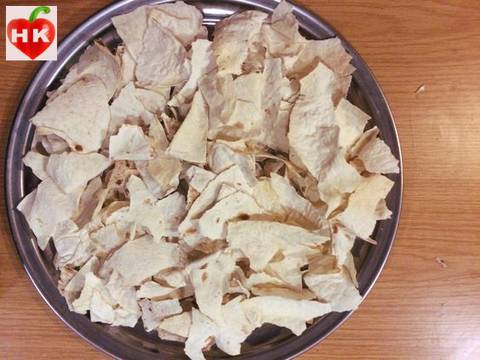 خامسا لتجهيز الخبز : نفتت الخبز باليد إلى قطع وسط ثم نفرده في صينية مناسبةوندخله الفرن حتى يتحمص ويتقرمش قليلا ثم نخرجه ونضعه جانبا