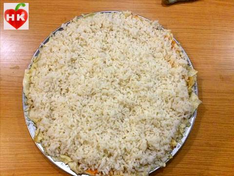 ثم نغطي الخبز بطبقة من الأرز الابيض