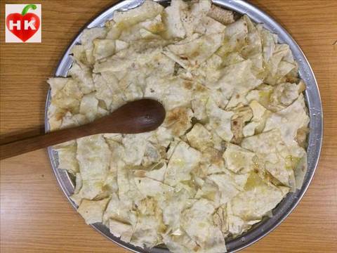 سادسا لتجهيز الفته : في صينية نفرد قطع الخبز ونسقى الخبز بكمية جيدة من مرق اللحم ونتركه 10 دقائق حتى يتشرب الخبز المرق تماما