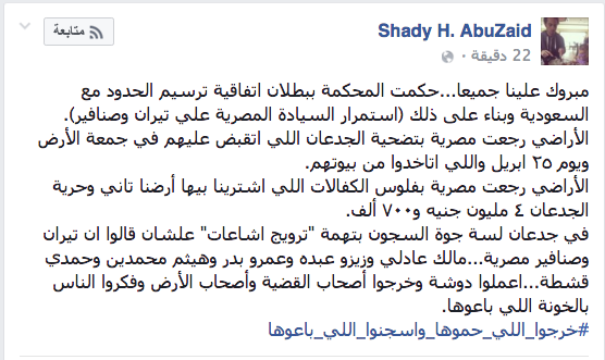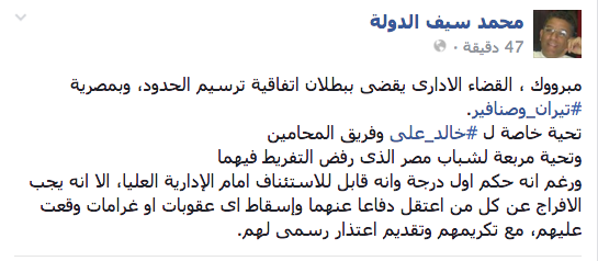 “مبروك علينا جميعا، حكمت المحكمة ببطلان اتفاقية ترسيم الحدود مع السعودية وبناء على ذلك :”استمرار السيادة المصرية علي تيران وصنافير”.