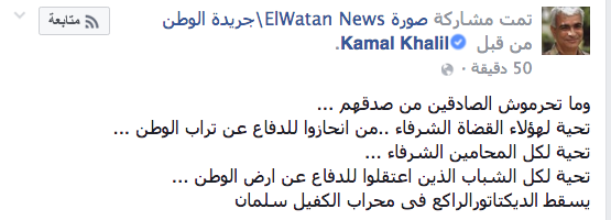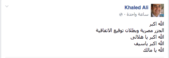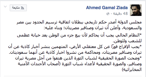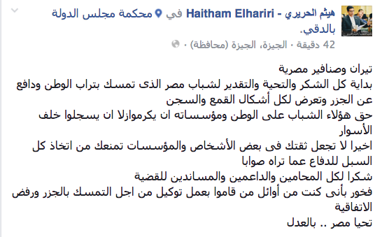 “تيران وصنافير مصرية، بداية كل الشكر والتحية والتقدير لشباب مصر الذى تمسك بتراب الوطن ودافع عن الجزر وتعرض لكل أشكال القمع والسجن”.