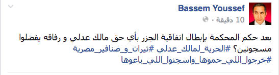 “بعد حكم المحكمة بإبطال اتفاقية الجزر بأي حق مالك عدلي ورفاقه يفضلوا مسجونين؟”.