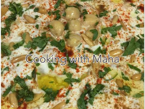 نضع فوقه الحمص الساخن جدا المخلوط مع نصف كمية التوم ، نضع ملح و بعض من ماء السلق ، يفضّل ان يكون طعم التوم واضحا قليلا
