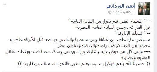 واختتم الوردانى تدوينته برسالة إلى كل من فوض وأيد وشارك وبارك ورضى وسكت عما فعله ويفعله الخائن المعتوه وعصابته (حسبنا الله ونعم الوكيل.. وسيعلم الذين ظلموا أى منقلب ينقلبون).