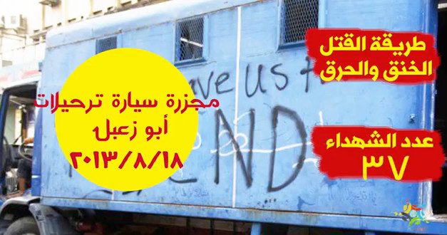 الخنق والحرق هكذا وصف مركز الشهاب لحقوق الإنسان طريق قتل 36 من مناهضى الانقلاب العسكرى فى سيارت الترحيلات التى ارتكبتها سلطات الانقلاب بتاريخ 18 أغسطس 2013، ولا تزال العداله غائبة عن القصاص لدماء شهداء المذبحة المعروفة إعلاميا بسيارة الترحيلات.