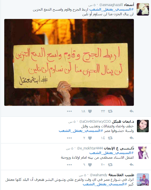 وتبادل المغردون صور المختفين قسريًا والمعتقلين بالسجون، كما شددوا على الظلم الواقع عليهم من قبل أذرع النظام الأمنية.