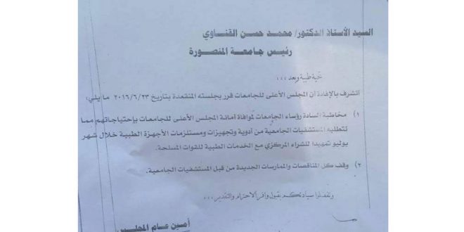 الوثيقة أظهرت توجيه الأمين العام للمجلس الأعلى للجامعات “أشرف حاتم” إلى رئيس جامعة المنصورة الدكتور محمد حسن قناوي، بإفادته باحتياجات المستشفيات الجامعية من أدوية ومستلزمات طبية تمهيدًا للشراء المركزي مع الخدمات الطبية للقوات المسلحة خلال شهر يوليو الماضي.