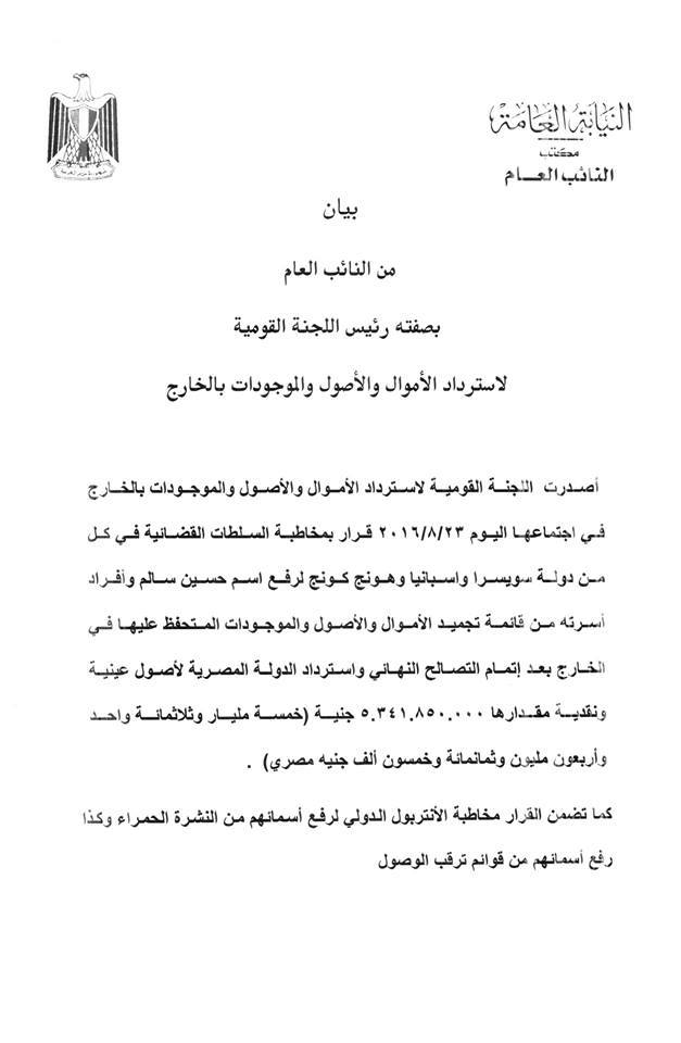 خاطب النائب العام ، اليوم الثلاثاء، سويسرا وأسبانيا وهونج كونج برفع اسم حسين سالم وأسرته من قائمة تجميد الأموال والأصول المتحفظ عليها بالخارج، عقب إنهاء إجراءات الصلح واسترداد الدولة المصرية لأصول عينية ونقدية بقيمة 5 مليارات و341 مليون و 850 ألف جنيه، كما خاطب الإنتربول الدولي لرفع أسمائهم من النشرات الحمراء وقوائم ترقب الوصول.
