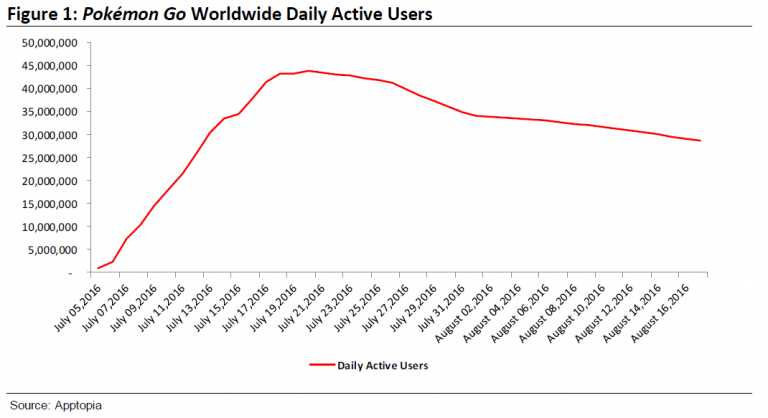 حسب بيانات شركة Axiom فإن لعبة بوكيمون جو وصلت إلى ذروتها في أعداد اللاعبين النشطين يومياً عند 45 مليون في منتصف شهر يوليو الماضي، وبعدها بدأت اللعبة تخسر اهتمام اللاعبين تدريجياً حتى وصل العدد إلى 30 مليون مستخدم نشط يومياً في الأسبوع الماضي.