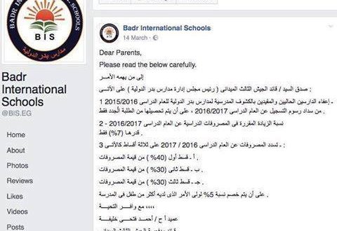 أعلنت إدارة مدرسة بدر الدولية على لسان أصحابها وملاكها وعنهم قائد المدفعية في الجيش الثالث الميداني اللواء أحمد فتحي خليفة إعفاء الدارسين بمدارس بدر الدولية والمقيدين بكشوف المدرسة للعام 2015/2016 من سداد رسوم التسجيل في المدرسة عن العام الحالي 2016/2017، على أن يتحملها الطلبة الجدد.