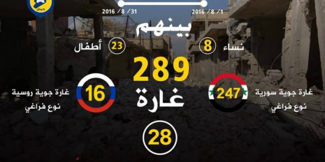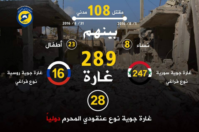 ووفق احصائية نشرها مركز الدفاع المدني في محافظة حمص فإن المحافظة خسرت ١٠٨ شهيد ، ثمانية منهم نساء و ٢٣ طفلاً ، بعد أن تم استهداف المحافظة بـ ٢٨٩ غارة جوية ، جلها نفذتها طائرات الأسد، حيث نفذت ٢٤٧ غارة ، فيما نفذ العدو الروسي ١٦ غارة ، استخدم في الغارات آنفة الذكر الصواريخ الفراغية ، فيما تم استخدام الصواريخ العنقودية في ٢٨ غارة .