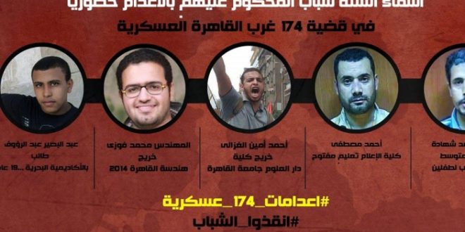 صدّقت محكمة غرب القاهرة العسكرية، أمس، على حكم الإعدام رسميًا على 8 متهمين فى القضية المعروفة إعلاميًا بـ “174 غرب”، التي تم الحكم فيها يوم 7 فبراير 2016 بإحالة أوراقهم إلى المفتي، منهم 6 محبوسين احتياطيًّا.