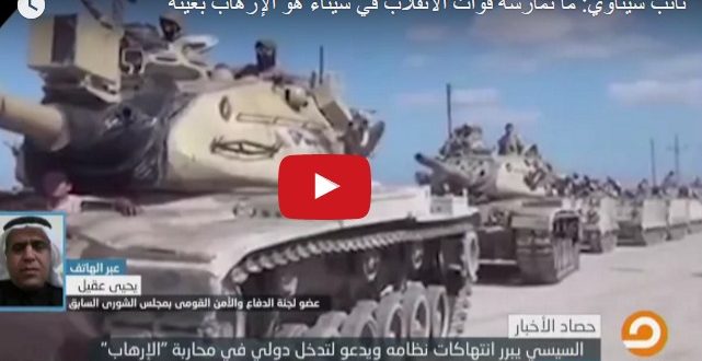 قال يحيى عقيل، النائب السيناوي: إن حديث عبد الفتاح السيسي، قائد الانقلاب العسكري، عن أن العنف انحسر في سيناء كذب محض، مضيفا أن ما تمارسه قوات الانقلاب في سيناء هو الإرهاب بعينه، فالسيسي يقتل الأهالي عشوائيا، ويفجر المنازل ويهجر الأهالي من بيوتهم.