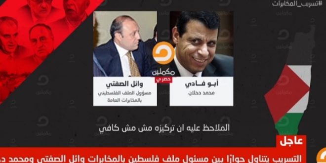 بثت قناة “مكملين” المصرية مكالمة هاتفية مسربة من داخل جهاز المخابرات المصرية، وهي عبارة عن حديث بين مسؤول الملف الفلسطيني في المخابرات المصرية اللواء وائل الصفتي، وبين القيادي السابق في حركة فتح محمد دحلان، وتتضمن المكالمة هجوما شرسا على الرئيس الفلسطيني محمود عباس وعدد من القيادات الفلسطينية، ومختلف الفصائل التي تمثل الشعب الفلسطيني.