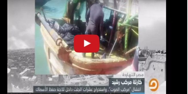 ويظهر الفيديو سفينة تابعة لسلاح البحرية المصرية أثناء انتشال المركب الغارق والذي كان يقل ما بين 470 إلى 600 شخص.