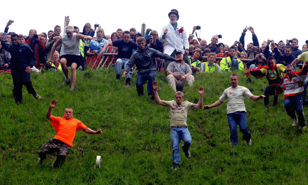 يتسابق المواطنون في إنجلترا، من أجل الحصول على قرص الجبن، حيث يلقى بالقرص من فوق منحدر ليتسابق المشاركون في الوصول للقرص، والفائز من يحصل عليه، ونظراً لمخاطر المسابقة وتعدد السقوط من المنحدر، ينتظر أسفل المنحدر عدد من رجال الإسعاف لتقديم العون.