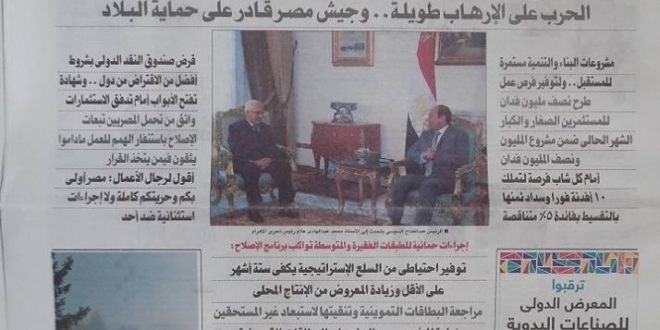 الموضوع الرئيس في الصحف الحكومية هو حوار السيسي مع رؤساء تحريرها حيث ينشر الجزء الأول منه اليوم وغدا الجزء الثاني.. ويعد الحوار انعكاسا لحالة الفزع والخوف من جانب قائد الانقلاب مع تصاعد عواصف الغضب الشعبي جراء الانهيار الاقتصادي الذي لم يحدث له مثيل في تاريخ البلاد حتى تجاوز سعر الدولار الـ16 جنيها وهو ما ينذر بتصاعد قسوة الإجراءات وسحقها للطبقات الفقيرة والمهمشة ويحاول السيسي تهدئة الأجواء  بمانشيتات وتصريحات رنانة لا تسمن ولا تغني من جوع.. وقد تكررت كثيرا وعوده وتصريحاته وقد ثبت يقينا أنها لا تساوي الحبر الذي كتبت به وذهبت كلها أدراج الرياح..  وأبرزا ما جاء في الحوار من وعود وتصريحات: