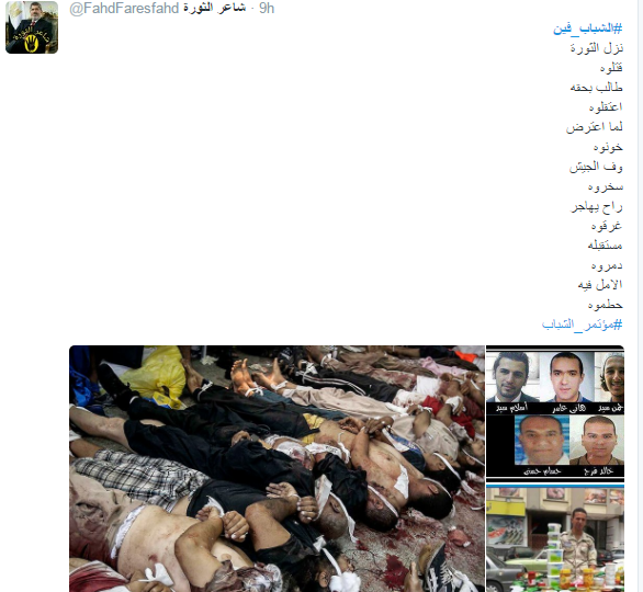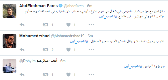 دشن رواد موقع التواصل الاجتماعي”تويتر” وسم “الشباب فين”، تزامنًا مع بدء فعاليات المؤتمر الوطني للشباب بمدينة شرم الشيخ ومشاركة 3000 شاب يمثلون الجامعات والرياضيين والمثقفين والأحزاب.