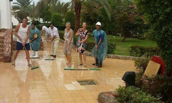تداول عدد من رواد مواقع التواصل الاجتماعى صورا لمشاركة السياح المقيمين بمدينة الغردقة فى تنظيف الفنادق التي يقيمون فيها، من أضرار السيول التى لحقت بها؛ وذلك على خلفية فشل نظام الانقلاب في حل آثار تلك السيول التي أودت بحياة العشرات بعدد من المحافظات.