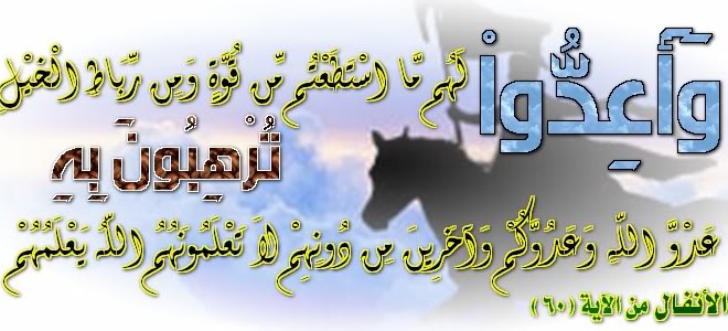 قال تعالي: ﴿وَأَعِدُّوا لَهُمْ مَا اسْتَطَعْتُمْ مِنْ قُوَّةٍ وَمِنْ رِبَاطِ الْخَيْلِ تُرْهِبُونَ بِهِ عَدُوَّ اللَّهِ وَعَدُوَّكُمْ وَآَخَرِينَ مِنْ دُونِهِمْ لَا تَعْلَمُونَهُمُ اللَّهُ يَعْلَمُهُمْ وَمَا تُنْفِقُوا مِنْ شَيْءٍ فِي سَبِيلِ اللَّهِ يُوَفَّ إِلَيْكُمْ وَأَنْتُمْ لَا تُظْلَمُونَ﴾ (الأنفال: 60).