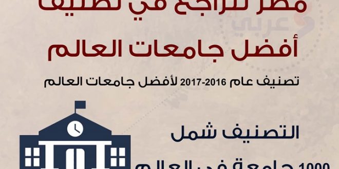 تراجع ترتيب مصر في قائمة أفضل الجامعات، ولم تجد لها مكانا إلا ما بين الشريحتين 600 – 800 وما بين 800 – 1000 في تصنيف عام 2016-2017 لأفضل جامعات العالم على موقع “تايمز هاير إديوكيشن” (timeshighereducation).