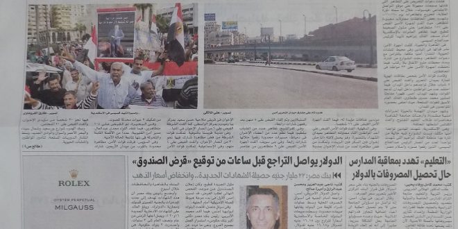 ونقلت المصري اليوم عن «بنك مصر: 22 مليار جنيه حصيلة الشهادات الجديدة.. وانخفاض أسعار الذهب».. وكتبت البوابة «عامر يجتمع بالبنوك غدًا.. الذهب يتراجع 20 جنيهًا بالأسواق والدولار يسجل 16.30 جنيه للشراء».. وكتبت “أخبار اليوم”: «استمرار تراجع الدولار بالسوق السوداء.. وحصيلة البنوك مليار دولار فى أسبوع»!