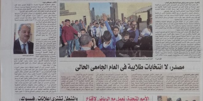 نقلت الشروق” عن مصدر أنه “لا انتخابات طلابية في العام الجامعي الحالي”.. أما اليوم السابع فنوهت إلى وجود أزمة في الجامعات بسبب الانتخابات.. ولفتت إلى أن طرح لائحة 2013 للنقاش الطلابي يؤجل عملية الاقتراع شهرًا على الأقل.. ونقلت عن الوزير أنه يتم جمع التعديلات من الجامعات خلال أسبوعين.