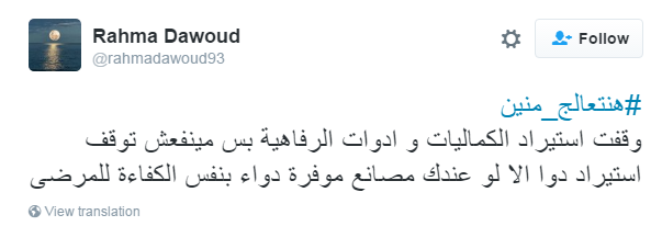 دشن مغردو موقع التدوين العالمي “تويتر” هاشتاج “هنتعالج منين” في ظل عجز وزارة الصحة عن توفير الدواء واختفاء أدوية منها الانسولين وعلاج سرطان الاطفال و دواء “كيتوستريل”، والمتاح منه بعد أن كان سعره 220 جنيهًا وتمَّ إيقاف استيراده من الخارج وصل سعره في السوق السوداء إلى 1000 جنيه لدرجة أنَّ الأطباء نادوا بتوزيعه بالشريط بدل العبوات لحاجة المرضى له.