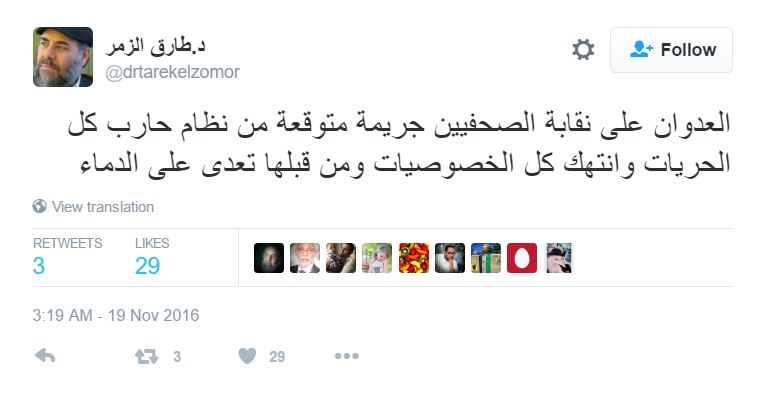 – د.طارق الزمر، رئيس حزب البناء والتنمية: “العدوان على نقابة الصحفيين جريمة متوقعة من نظام حارب كل الحريات وانتهك كل الخصوصيات ومن قبلها تعدى على الدماء”.