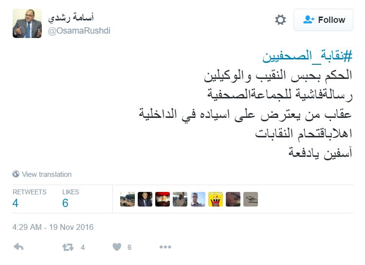 – د. أسامة رشدي، ناشط حقوقي: “الحكم بحبس النقيب والوكيلين رسالة فاشية للجماعة الصحفية.. عقاب من يعترض على اسياده في الداخلية اهلا باقتحام النقابات.. آسفين يادفعة”.
