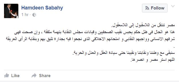 – حمدين صباحي: “مصر تنتقل من اللامقبول إلى اللامعقول.. هذا هو الحال فى ظل حكم يحبس نقيب الصحفيين وقيادات مجلس النقابة بتهمة ملفقة “.