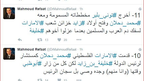 وفي واسطة عقد تغريداته (11) قال د. محمود رفعت: “أخرج توني بلير مخططاته المسمومة ومعه محمد دحلان، وفتح أولاد زايد خزائن شعب الإمارات لسفك دم العرب والمسلمين بعدما عزلوا أخوهم خليفة”.