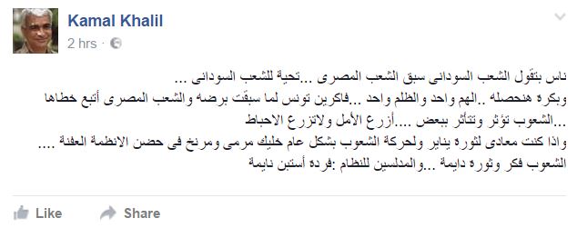 كتب الناشط اليساري كمال خليل، منشورًا، يعلق فيه عن الأحداث في السودان، بعد يومين من الإضراب، والمطالبة بالتمديد ليوم ثالث، مطالبًا بنشر أخبارهم، واصفًا السودان بـ “البشارة والإشارة”.