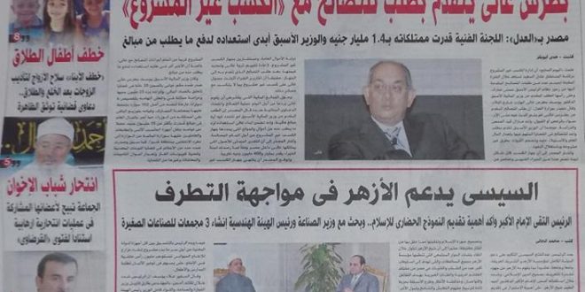 تناولت صحف اليوم لقاء السيسي بالشيخ أحمد الطيب شيخ الأزهر الموالي للعسكر وسلطات الانقلاب حيث قالت الأهرام إن السيسي يؤكد دعم الدولة الكامل للأزهر الشريف ويشيد بدوره.. خلال استعراضه جهود تصويب الخطاب الدينى مع الدكتور أحمد الطيب.