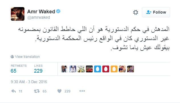 وقال واكد، في تدوينة له عبر حسابه الشخصي على موقع التواصل العالمى “تويتر”: “المدهش في حكم الدستورية.. هو إن اللي حاطط القانون بمضمونه غير الدستوري، كان في الواقع رئيس المحكمة الدستورية.. إللي يعيش ياما يشوف”.