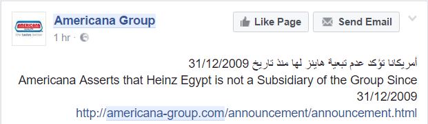 نفت مجموعة أمريكانا، اليوم الإثنين، تبعية شركة “هاينز” لإنتاج الكاتشب والصلصلة لها، مؤكدة عدم صحة ما نشر في المواقع الإلكترونية بخصوص تبعية”هاين- مصر” إلى مجموعة أمريكانا.