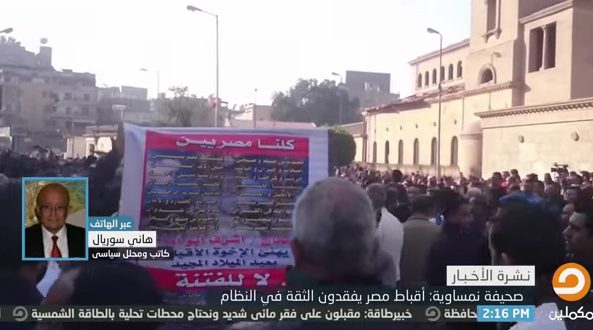 قال الناشط المسيحي هانى سوريال، إن المسيحيين فى حال تضارب بسبب تواضروس وتأييده لعبدالفتاح السيسى، ومندفعين بقوة على أمل حكم مصر، مع بعض القلة الليبرالية على الأغلبية المصرية هناك.