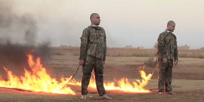 وبعد أن قام عناصر التنظيم بإحراق الجنديين، صبّ عليهما أحد جنود التنظيم مادة حارقة، لتشتغل النيران في جسديهما المتفحمين مرة أخرى.