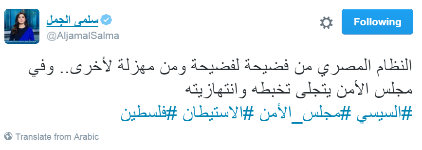 كما قالت الإعلامية الفلسطينية سلمة الجمل، في تغريدة عبر حسابها على موقع التدوين المصغر “تويتر”: “النظام المصري من فضيحة لفضيحة ومن مهزلة لأخرى، وفي مجلس الأمن يتجلى تخبطه”.