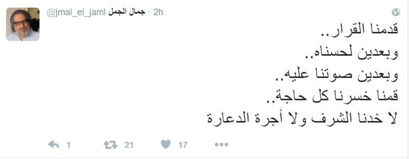 وقال الكاتب جمال الجمل، عبر تدوينة لع على موقع التدوينات الصغيرة “تويتر”، “قدمنا القرار.. وبعدين لحسناه.. وبعدين صوتنا عليه.. قمنا خسرنا كل حاجة.. لا خدنا الشرف ولا أجرة الدعارة”.