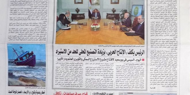 حيث جاء في مانشيت الأهرام «التوسع فى المنتجات المدنية للإنتاج الحربى».. وبرر السيسي ذلك بطلبه أعلى درجات الجودة للسلع المحلية لتلبية احتياجات المواطنين تقليلا للاستيراد.. كما يعمل السيسي على افتتاح مشروع الاستزراع السمكي الذي يشرف عليه جنرالات أيضا.
