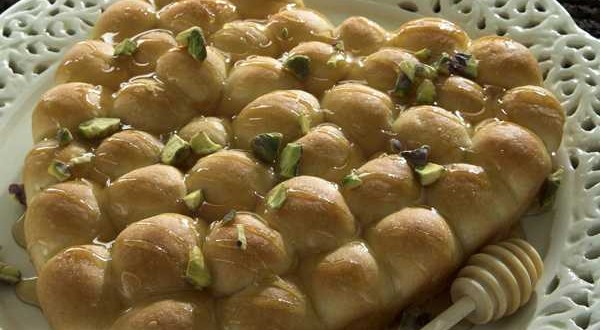 بعد خروج القالب من الفرن يصب الشربات البارد على الخلية ويزين بالفستق.