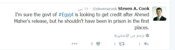 قال “ستيفن كوك “، الباحث المختص بشئون الشرق الأوسط بمعهد “إني إنريكو ماتي” معقبا على إفراج السلطات المصرية على أحمد ماهر مؤسسة حركة السادس من إبريل:”أنا متأكد من ان الحكومة المصرية تبحث عن تجميل وجهها بعد الإفرج عن أحمد ماهر”.