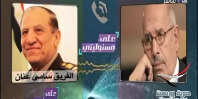 وقد عرض إعلامي المخابرات أحمد موسى تسريبًا صوتيًا لمكالمة هاتفية بين الدكتور محمد البرادعي والفريق سامي عنان رئيس أركان القوات المسلحة في ذلك الوقت، أمس السبت، من خلال برنامجه “على مسئوليتي” على فضائية صدى البلد، وذلك أثناء أحداث ثورة يناير.