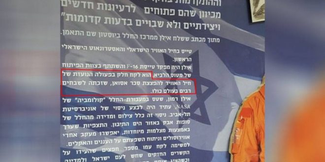 كشف “رونين بيرجمان” كبير مراسلي الشئون الأمنية والاستخبارية بصحيفة “يديعوت أحرونوت” عن فضيحة من العيار الثقيل، بتوزيع ملصقات في المدارس الإسرائيلية احتفالا بذكرى رائد الفضاء الإسرائيلي “إيلان رامون” الذي قتل في تحطم المكوك الفضائى كولومبيا في رحلة وكالة ناسا للفضاء عام 2003، تقول هذه الملصقات إنه شارك كقائد مقاتلة إف- 16 في قصف السد العالي.