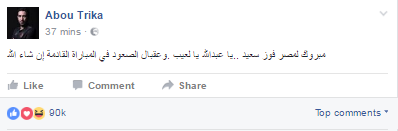 وقال “أبو تريكة” عبر حسابه الشخصي بموقع التواصل الاجتماعي “تويتر”، مساء اليوم: “مبروك لمصر، فوز سعيد يا عبدالله يا لعيب، وعقبال الصعود في المباراة القادمة، إن شاء الله”.