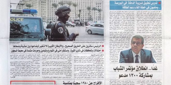 • السيسى: ثورة 25يناير نقطة تحول فى تاريخ مصر.. الرئيس: سائرون على الطريق الصحيح.. والأوطان الكبيرة لا تتغير أوضاعها بين عشية وضحاها.. احتفالات بالمحافظات فى ذكرى الثورة.. واستنفار أمنى فى الشوارع والميادين وإجراءات مشددة فى محيط السجون
